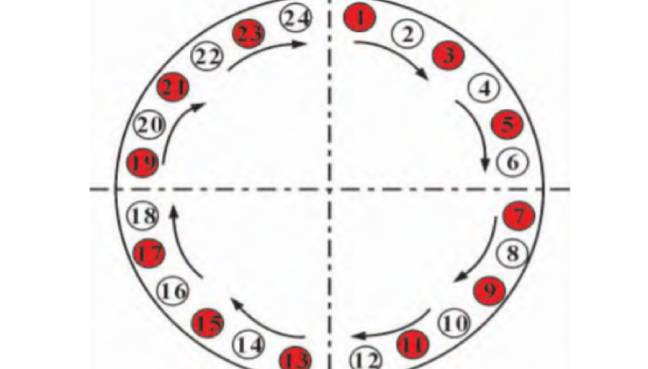 如上圖24路螺栓法蘭50%螺栓拉伸器覆蓋編號圖我們可以看出,螺栓依然是依次編號,只不過在安裝螺栓拉伸器時是總數分為兩組,隔一顆安裝,總體覆蓋便可以達到50%也就是12顆。安裝好之后按步驟拉伸即可。如此可知,24路螺栓法蘭25%的螺栓覆蓋需要做到6同步編號,也就是6組4個號,先均分為6個點標“1”,再取間隔之中為“2”,依次取中編“3”,編“4”,編完即可。拉伸時按照編號分次拉伸。
