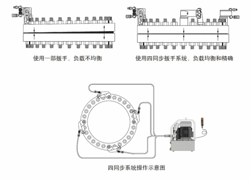 對于較大的扳手,建議用一臺泵控制兩同步系統,或二泵二扳手同時對邊鎖緊的雙系統。